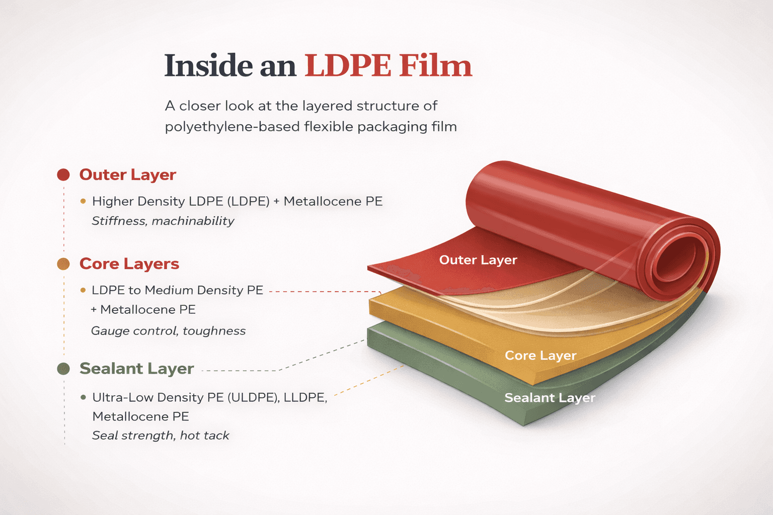 What is often overlooked is that an “LDPE film” is rarely a single material. In most modern flexible packaging, LDPE films are engineered structures made from multiple polyethylene layers, each selected to perform a specific function. A single film may include blends of low-density polyethylene, medium-density polyethylene, and ultra-low-density polyethylene, combined to balance strength, flexibility, and seal performance. Metallocene-based polyethylene is frequently added to improve toughness, consistency, and seal reliability, especially in demanding or high-speed applications.